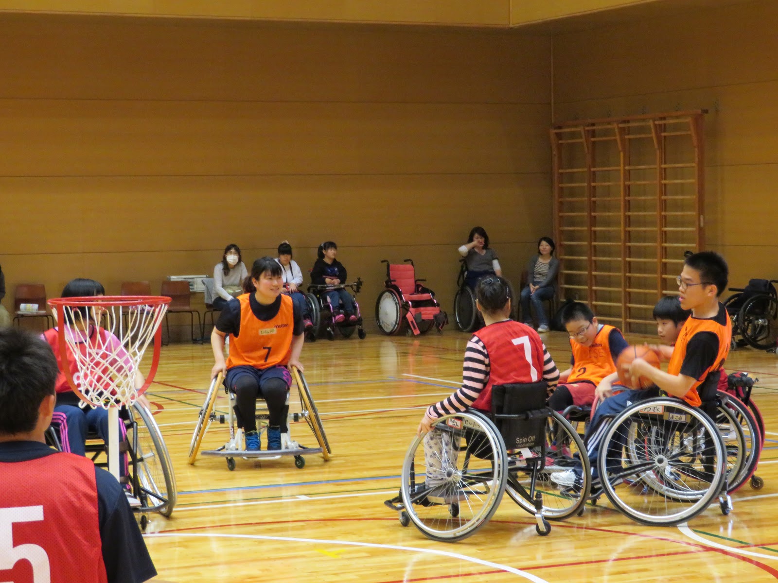 練習でやった車椅子操作やパス,シュートが試合でも生かされていて,毎回白熱した試合展開で盛り上がっています!パスもみんなでつなげるようになってきました!