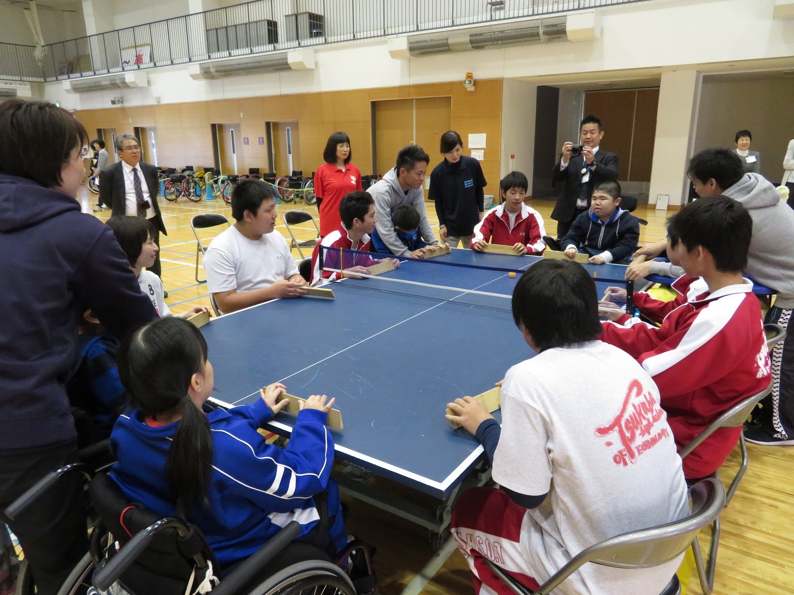 続いて実際に座ってできるスポーツの体験を行いました。まずは卓球バレーです。