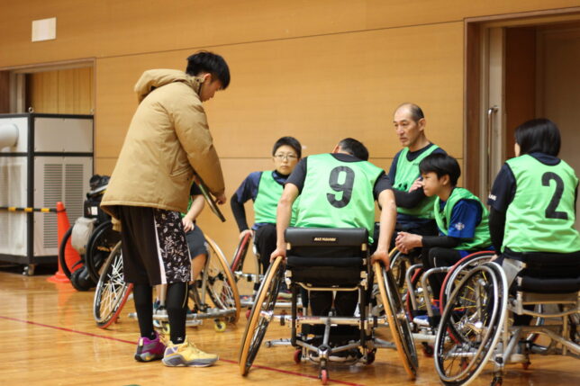 車いすバスケットボールをプレイしている方が集まり、独自のチーム分けを行います。
